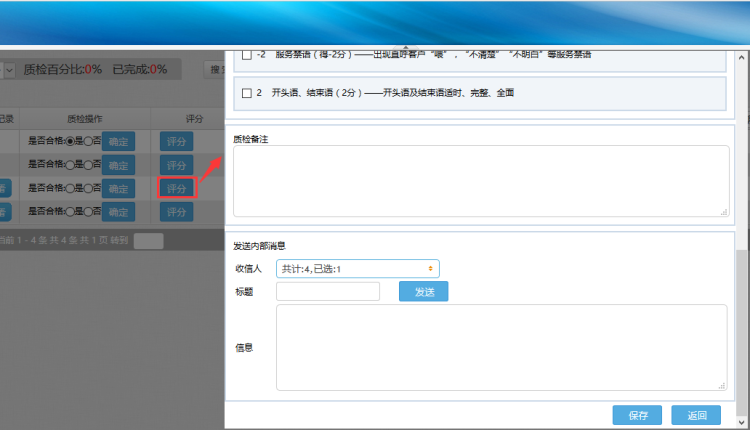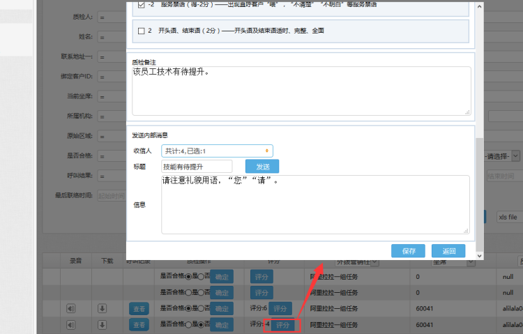 我们在质检评分窗口,选择加减分选项框,点击保存既完成质检,您还可以在质检评分的同时给坐席发送消息,在发送内部消息栏,输入相关内容消息,选择发送,发送信息给坐度,系统默认只发送给通话归属坐席,如下图,