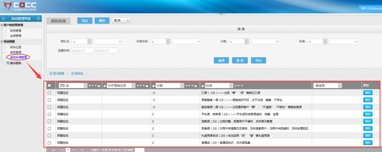 例如下面内容,质检管理员对坐席人员的服务用语进行质检,满分10分,设置加减分,我们需要将质检标准配置到COCC系统中。