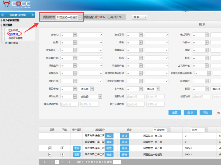 1. 打开左侧管理列表,点击【外呼营销】→【质检管理】,我们选择要质检的外呼营销任务,如下图,我们选择的是“阿里拉拉一组任务”